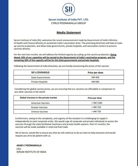 Goemkaponn Desk PUNE: Covishield will be sold at Rs 400 a shot to state governments and Rs 600 to private…