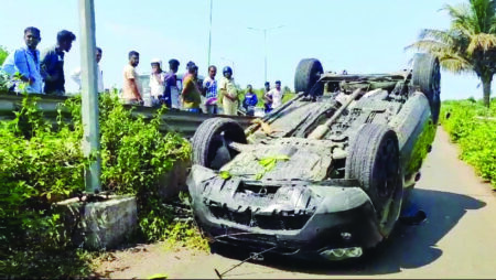 Goemkarponn Desk BASTORA: An automobile that was traveling at a high speed lost control and turned turtle on the Bastora…