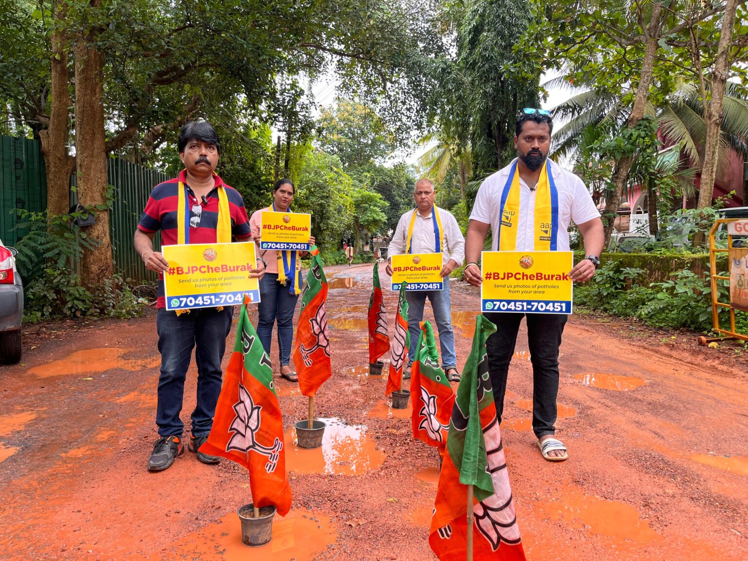 Team Goemkarponn PANAJI: The Aam Aadmi Party’s (AAP) statewide campaign #BJPCheBurak entered its fourth day on Wednesday, with leaders and volunteers staging protests in Calangute, Mandrem and St Cruz to highlight what they termed as the “pathetic and unsafe” condition of Goa’s roads. AAP accused the BJP government of betraying Goans with false promises of development, claiming that despite crores spent on repairs, roads across the state remain riddled with potholes. The party said its helpline number under the campaign has received an “overwhelming response” from citizens reporting road issues. AAP Vice President Chetan Kamat, who led the protest in…
