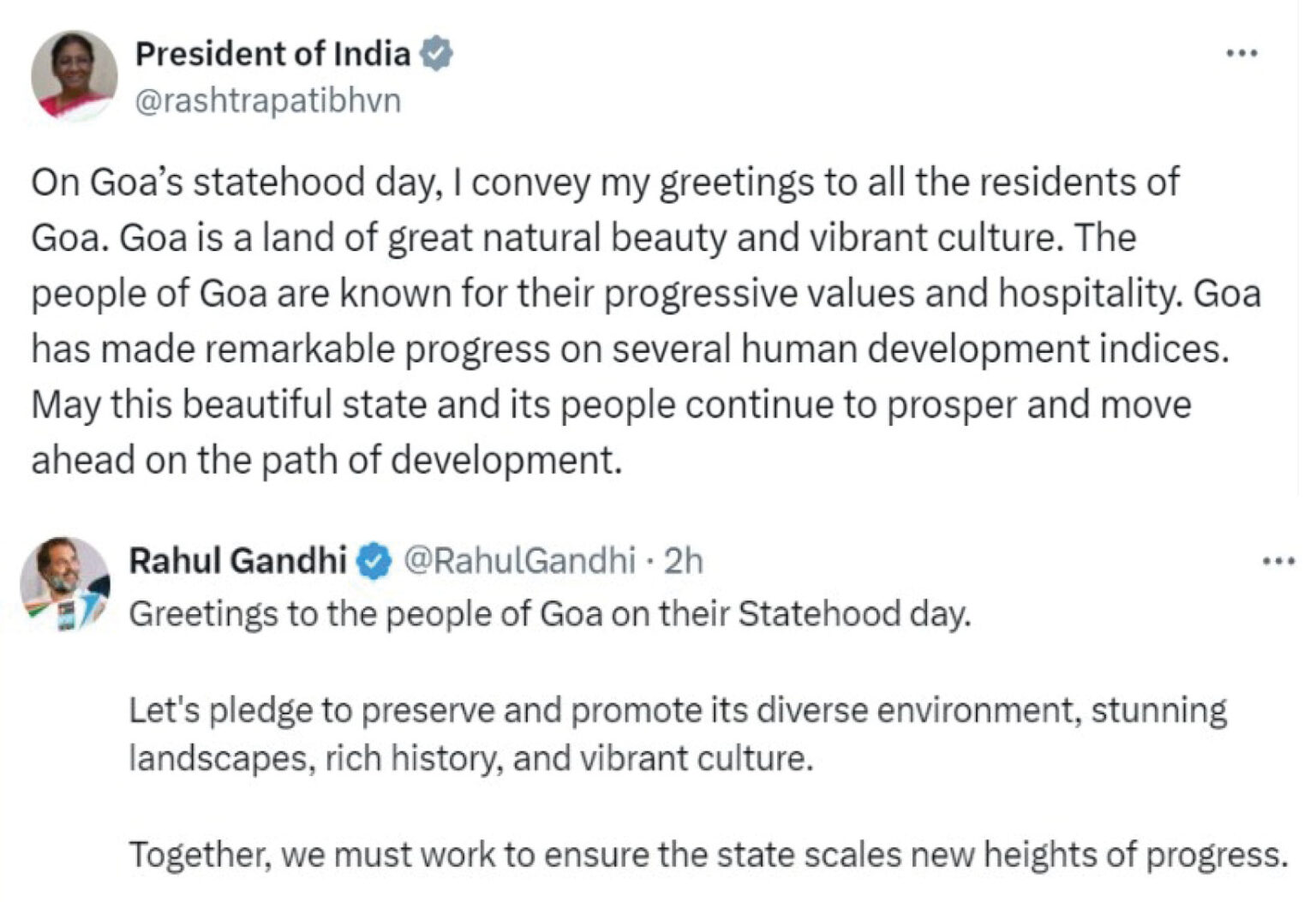 Goemkarponn desk PANAJI: On Goa Statehood Day today, President Droupadi, Goa Chief Minister Pramod Sawant, and Goa Governor P.S Sreedharan Pillai extended their heartfelt wishes to the people of the state. Several other national leaders Amit Shah and Rahul Gandhi also wished the people of Goa on this historic day. On this day in 1987 when Goa became the 25th State of the Indian Union. President of India Droupadi Murmu in her message conveyed her greetings to all the residents of Goa. Goa is a land of great natural beauty and vibrant culture. “The people of Goa are known for…