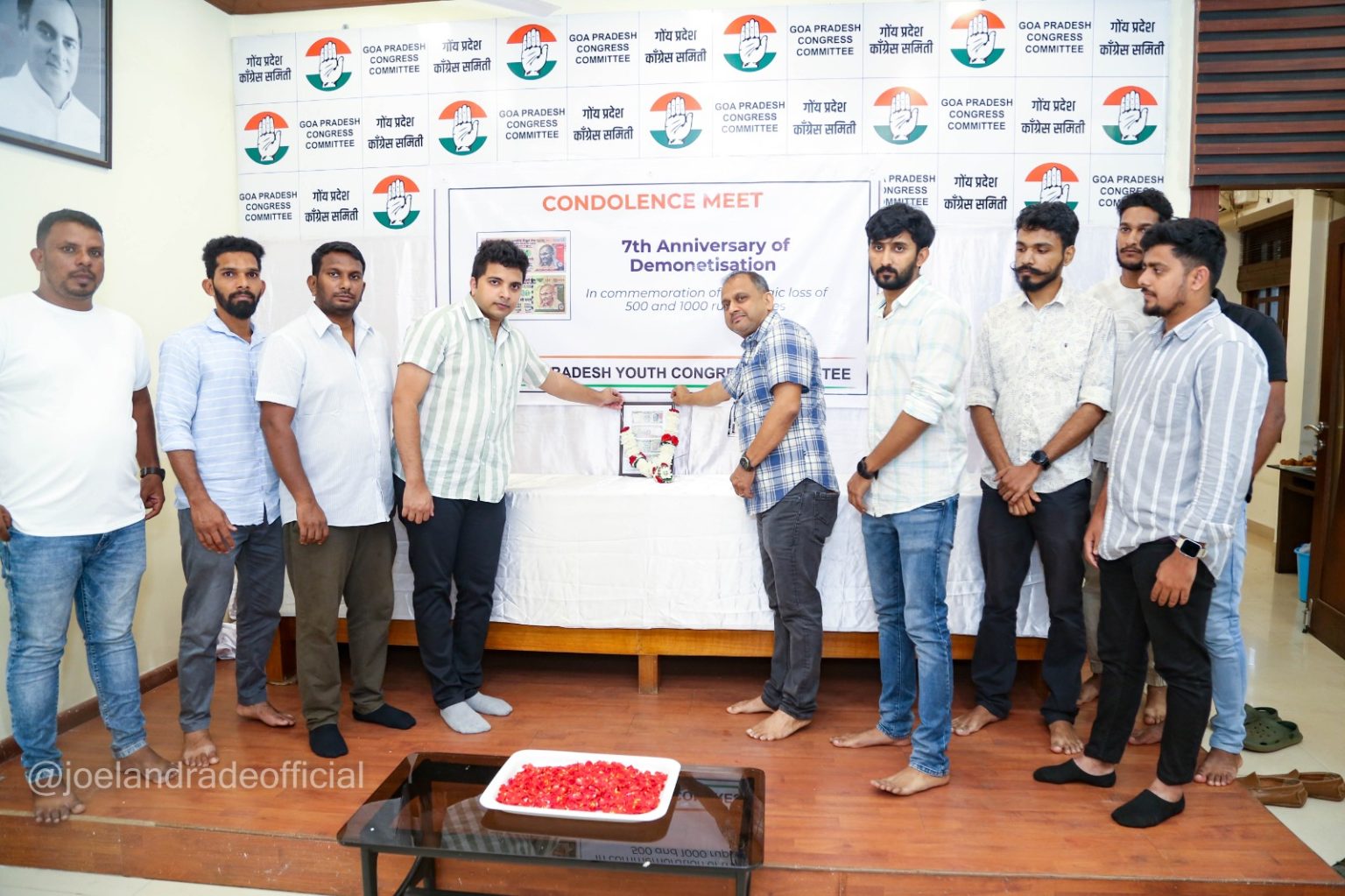 Goemkarponn desk PANAJI: Goa Pradesh Youth Congress President Joel Andrade and his office bearers on Wednesday observed the seventh death anniversary of the old Rs 500 and Rs 1000 notes at a condolence meeting organised by the Goa Pradesh Youth Congress at the Congress House in Panaji. Goa Pradesh Congress Committee Vice President Tulio de Sousa was the Chief Guest for the function. Andrade, who is also a Panaji Corporator, recalled the days of horror of November 8, 2016 when the Prime Minister announced in the evening that all notes of Rs 500 and 1,000 denomination were being demonetized in…