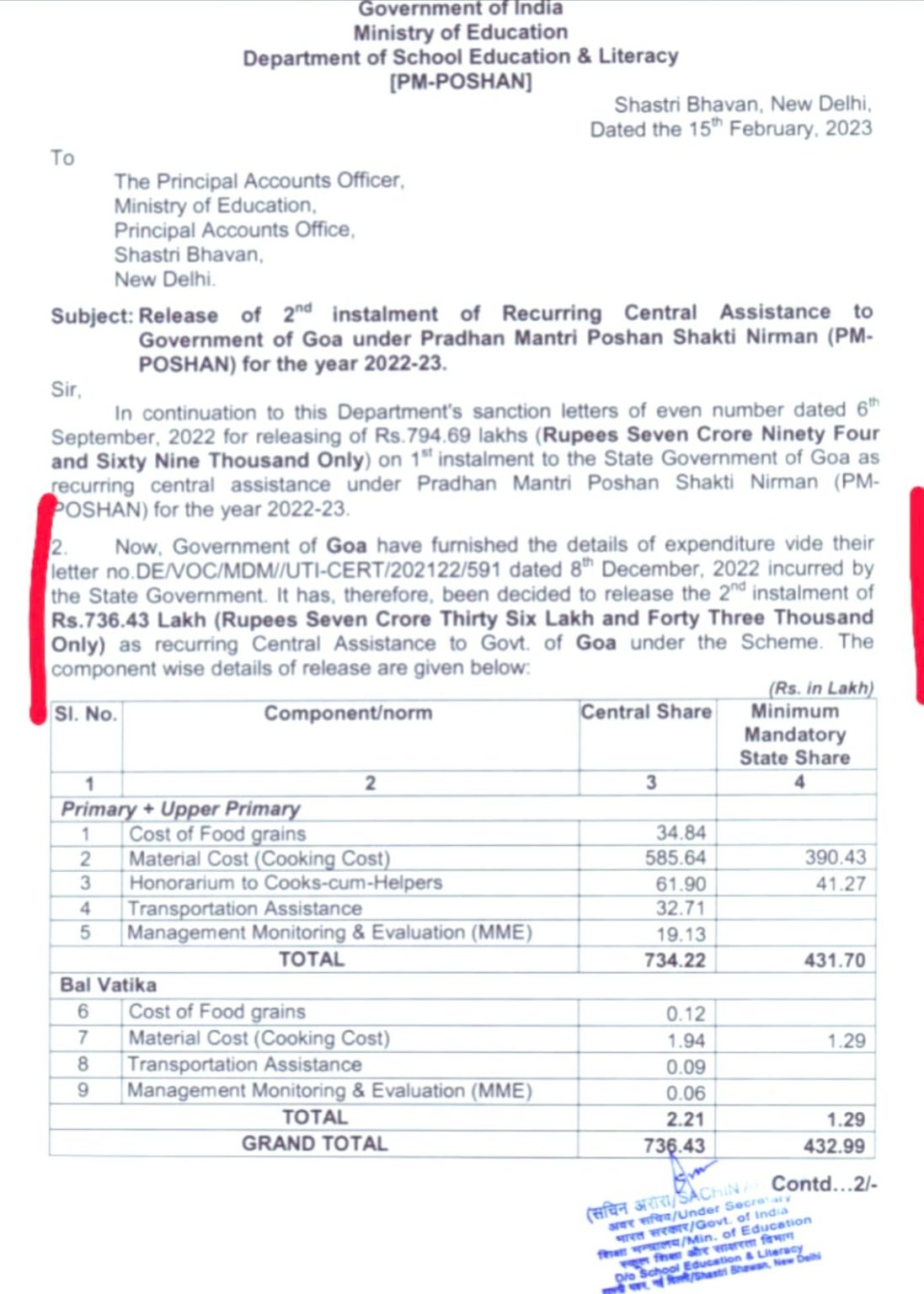 Goemkarponn Desk PANAJI: Amidst claim from Directorate of Education about non release of payement by Centre towards mid-day meal, the Goa Forward Party has exposed that Centre via a two different installments has released over Rs 14 crore in last six months. GFP Vice President Durgadas Kamat, via a social media, has made public communication from Union Education Ministry with regards to release of payment under Pradhan Mantri Poshan Shakti Nirman. The first installment of Rs 7.94 cr were released in September, 2022 while another Rs 7.36 cr are released in the ongoing month that is on February 15. “Education…