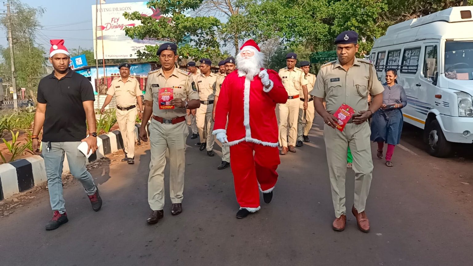 Goemkarponn desk CALANGUTE: In sync with the Christmas spirit, Calangute police on Saturday adopted a unique way to educate traffic violators in the city. Dressed as Santa Claus, police constables distributed chocolates and educated motorists and two-wheeler riders about traffic safety, drugs and cybercrime. “We intercepted violators and educated them about their safety. We used the occasion to spread the message in our own special way,” of Calangute police inspector Dattaguru Sawant said. While several two-wheeler riders were found wearing helmets without the mandatory ISI mark or strapping them on properly, he added that motorists were found driving without putting…