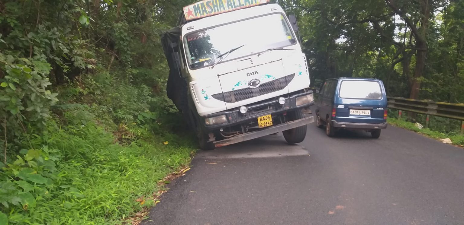 Goemkarponn desk CANACONA – Trucks bringing Mines material from Karnataka are blamed for the traffic indiscipline resulting in mishaps along the narrow NH-66 road in Canacona. A Mining Truck bearing registration no. KA 04 AC 2842 is caught on the right side of the roadside trench (towards Margao) at Karmalghat. The loaded truck coming from Hospet (Karnataka) was reportedly attempting to overtake another loaded heavy vehicle at a slight right turn towards Margao, and instead, its right-side wheels went down roadside drainage trenches. The truck has been lying there for almost a week now, as vehicles coming down the Karmalghat…
