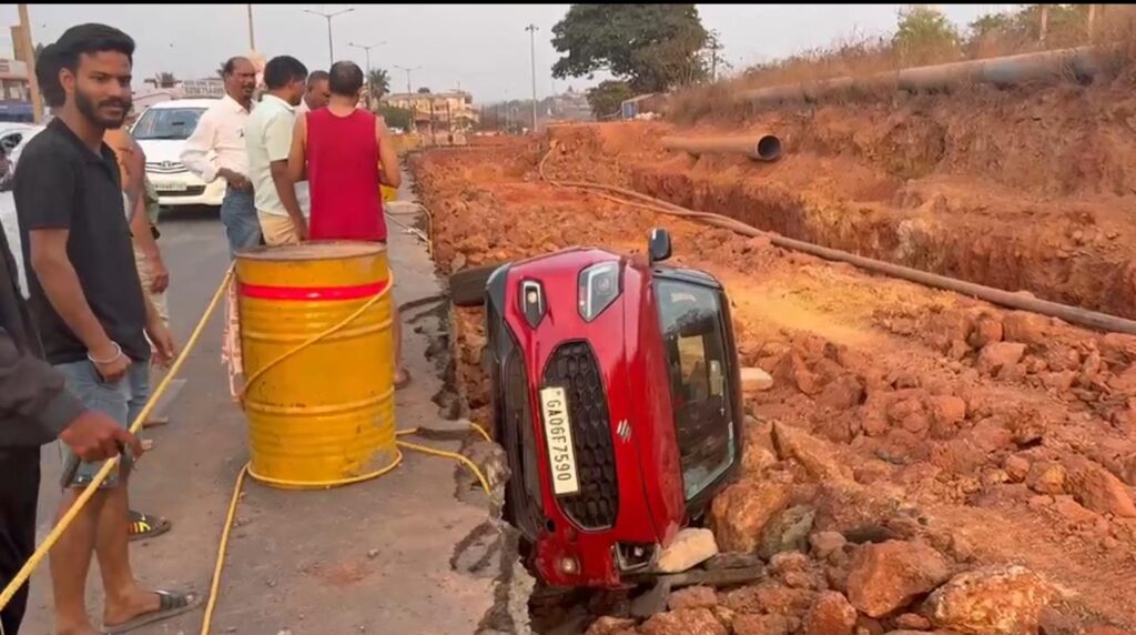 Team Goemkarponn DABOLIM: A red Maruti Swift was found off the roadside near MES College during the ongoing construction of an overbridge on the highway. The incident is suspected to have occurred due to unstable conditions in the area, including loose gravel and uneven road surfaces. Fortunately, no casualties or injuries were reported. Authorities and construction workers quickly reached the spot to assess the situation and ensure safety measures were in place. Traffic movement in the area was briefly disrupted but was later brought under control.