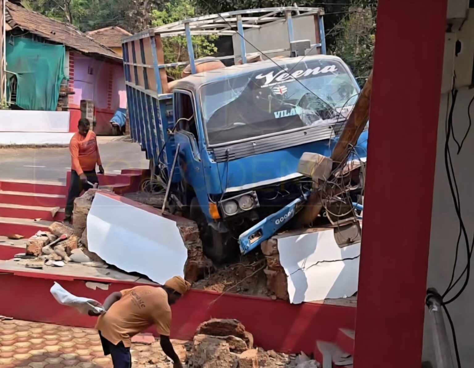 Team Goemkarponn Canacona: A loaded truck carrying cement bags rammed into the compound wall of the Shree Nirakar Devasthan at Kindlem in Canacona on Thursday. According to sources, the driver of the cement-laden truck reportedly lost control of the heavy vehicle, which veered off the road and crashed into the temple compound, shattering a portion of the wall. An electricity pole with overhead cables located within the premises was also damaged in the mishap. Fortunately, no one was present inside the temple premises at the time of the accident. The driver escaped unhurt, though the front portion of the truck,…