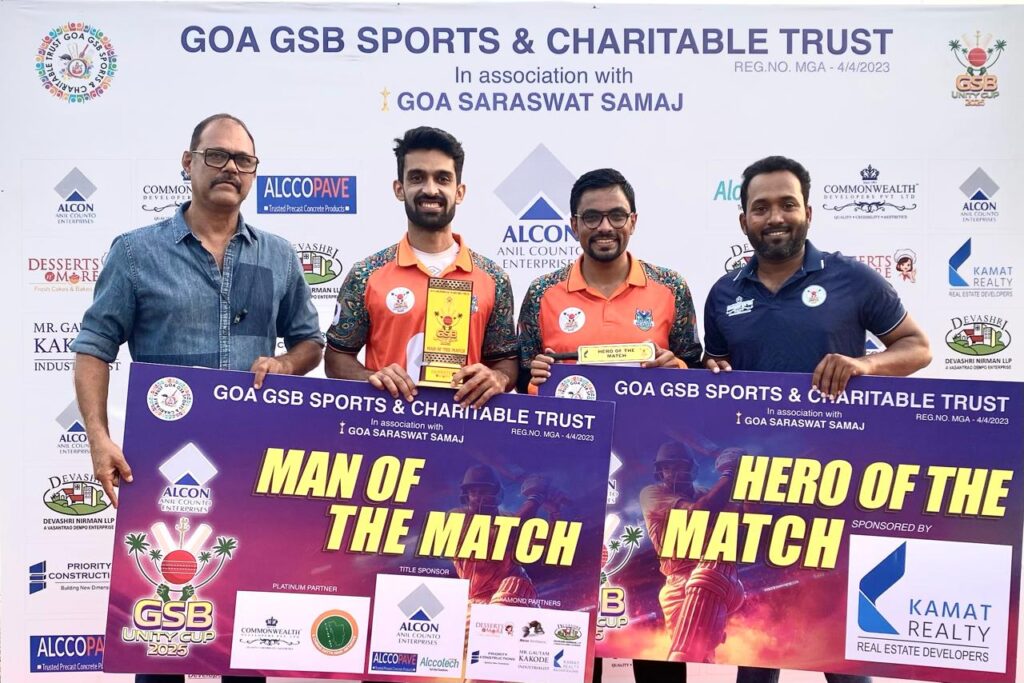 Margao: The Alcon GSB Unity Cup T20 cricket tournament, organized by Goa GSB Sports & Charitable Trust in association with Goa Saraswat Samaj, witnessed two contrasting matches on Sunday at the MCC Ground, Margao. While Priority Titans cruised to a dominant win over Rising Stars of Antruz, Canacona Mathagram United edged out Sinq Rangers UC in a nail-biting finish.