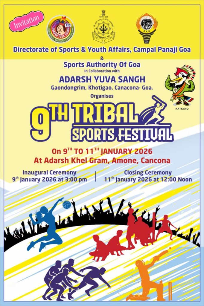 Panaji: The Directorate of Sports and Youth Affairs, Campal Panaji, along with the Sports Authority of Goa, will organise the Gutribal Katkato Sports Festival in collaboration with Adarsh Yuva Sangh, Gaondongrim, Khotigao, Canacona. The three day sports festival will be held from January 9 to January 11, 2026, at Adarsh Khel Gram, Amone, Canacona.