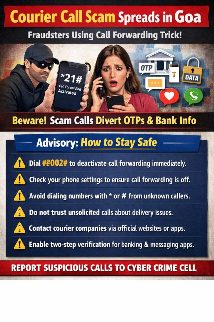 Panaji: A new courier-related scam is reportedly spreading across Goa, with fraudsters posing as delivery agents to trick individuals into activating call forwarding on their mobile phones, potentially compromising sensitive information and bank accounts.