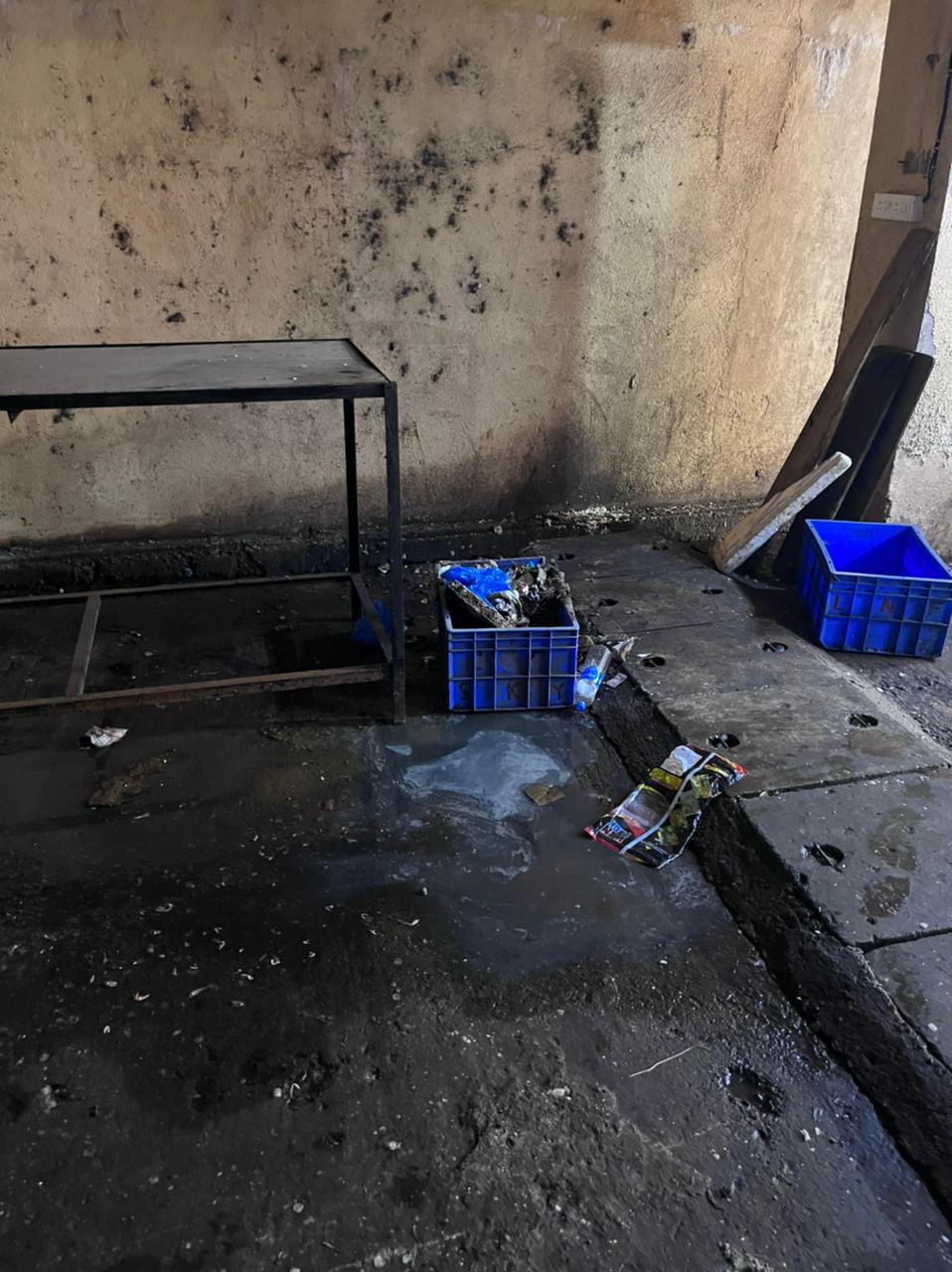 During the inspection, multiple deficiencies were observed, including unclean flooring with foul odour, clogged wastewater drainage, accumulation of empty fish crates, inadequate lighting and ventilation, and the need for overall maintenance and painting.