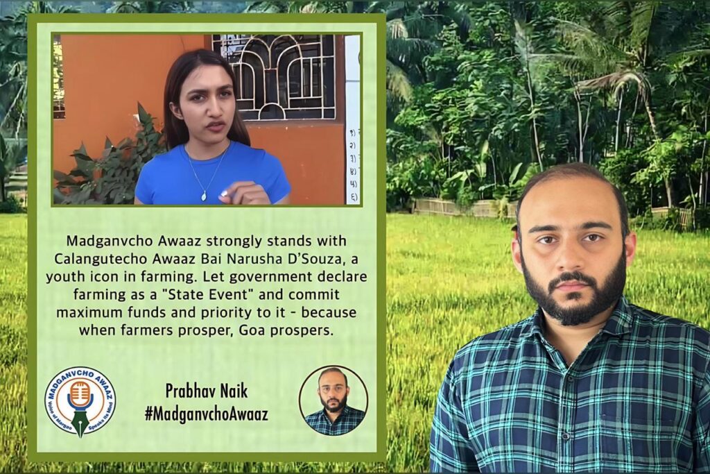 Margao: Madganvcho Awaaz has strongly extended its support to Calangutecho Awaaz and young progressive farmer Bai Narusha D’Souza, who has emerged as a youth icon in farming through her dedication and grassroots efforts. Emphasising that farming is the backbone of Goa’s economy and culture, youth leader Prabhav Naik said agriculture deserves the highest priority from the government.