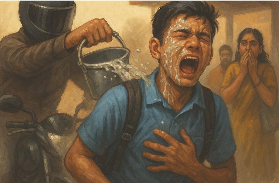 The incident has sparked outrage and renewed calls for stricter enforcement of laws regulating the sale and storage of corrosive substances.