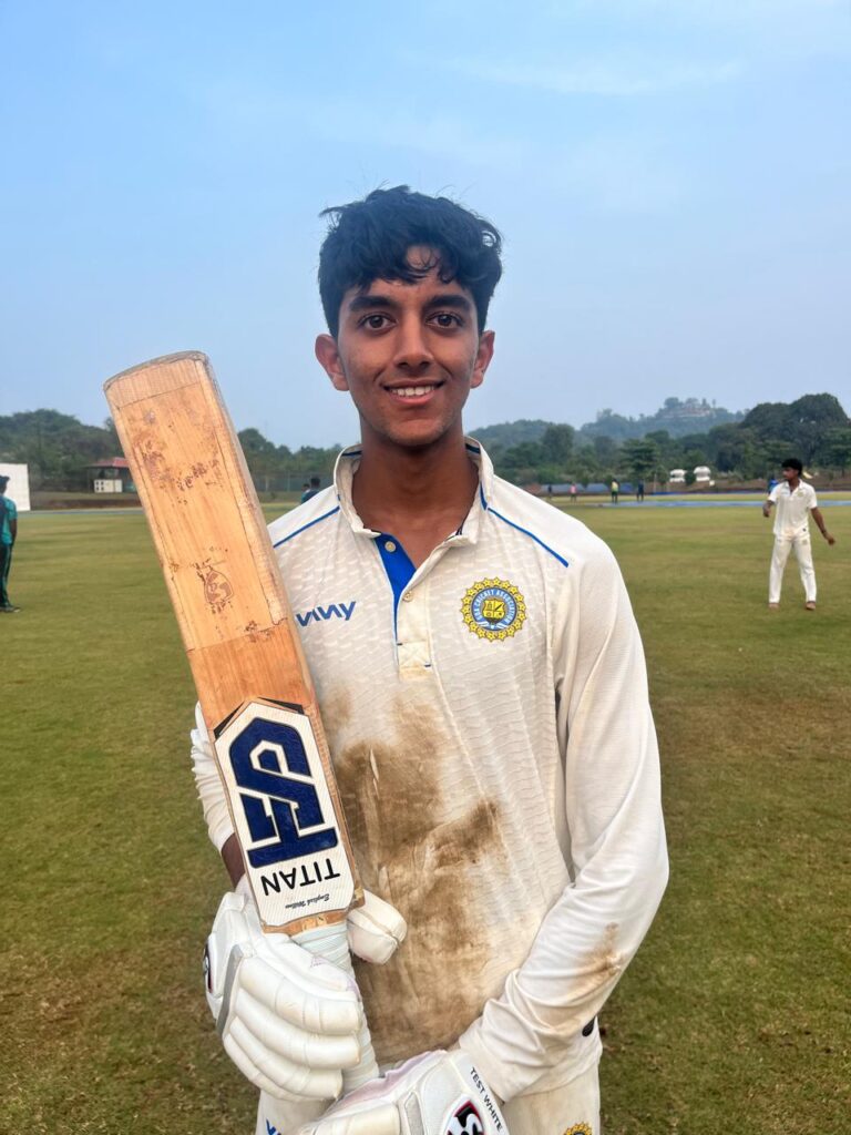 Goa lost early wickets and were unable to recover until a crucial partnership steadied the innings. The fifth wicket stand between Dishank Misquin and Aradhya Goyal proved to be the backbone of Goa’s total. The pair added 76 runs and briefly shifted the momentum in Goa’s favour. Misquin played a composed knock of 44, showing patience against the moving ball, while Goyal top scored with a well made 50 that included five crisp boundaries.