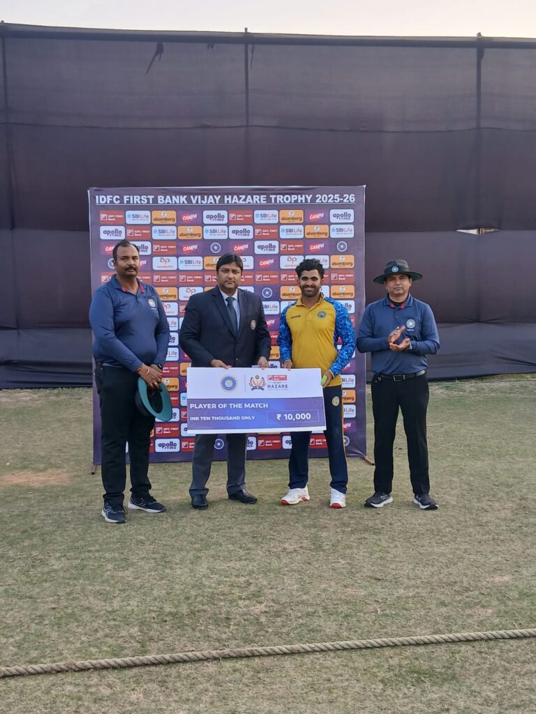 Pukhraj Mann mounted a strong resistance with a fighting 126 off 119 balls, striking 14 fours and three sixes, but lacked sustained support. Gaonkar broke the resistance by dismissing Mann in the 46th over, completing a five-wicket haul. Despite a brief lower-order push, Himachal fell short.