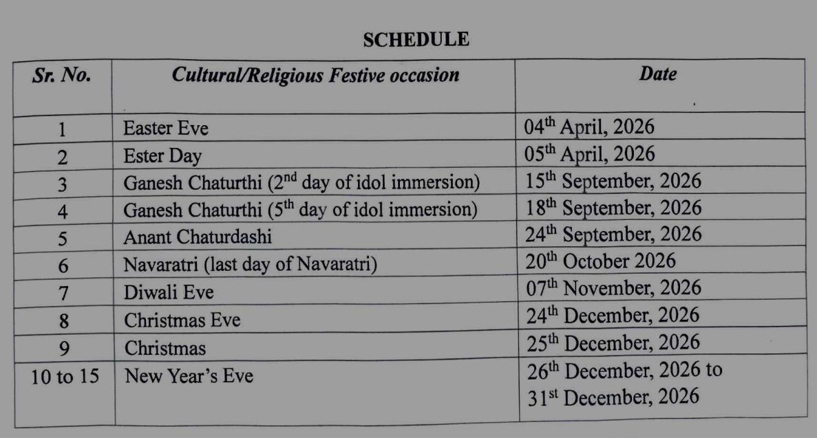 The notified dates include Easter Eve (April 4), Easter Day (April 5), Ganesh Chaturthi immersions on September 15 and 18, Anant Chaturdashi (September 24), Navaratri last day (October 20), Diwali Eve (November 7), Christmas Eve (December 24), Christmas Day (December 25) and New Year celebrations from December 26 to 31.