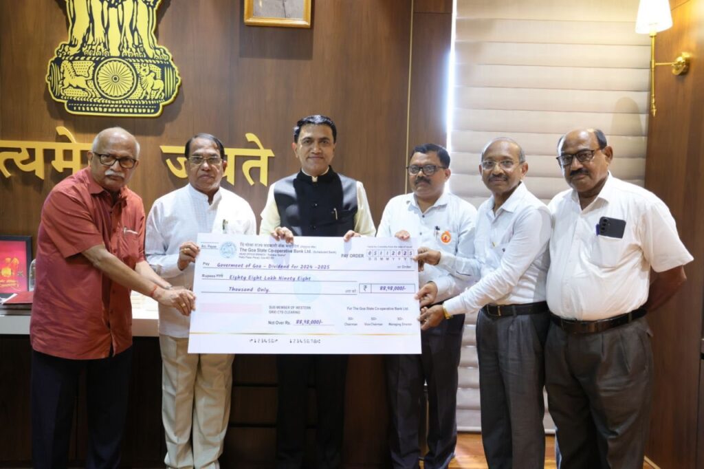 PANAJI: Chairman of The Goa State Co-operative Bank Ltd. (Scheduled Bank), Pandurang Kuttikar, presented a cheque of ₹88.98 lakh to Chief Minister Dr. Pramod Sawant as dividend to the Government of Goa.