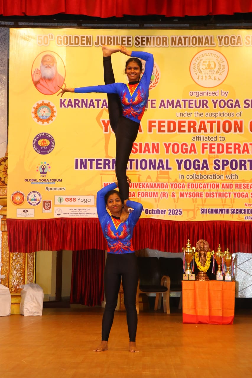 Panjim: The Goa Yoga Association, recognized by the Sports Authority of Goa, proudly announced that the Goa team secured one silver and two bronze medals at the 50th Senior National Yogasana, Artistic, Rhythmic and Sports Championship held from October 9 to 12, 2025, at Ganapati Sacchidananda Ashrama, Mysore, Karnataka. The event was organized by the Karnataka Yoga Association under the auspices of the Yoga Federation of India. The glittering inaugural ceremony was graced by Shri Yaduvir Wodeyar, King of Mysore and sitting Member of Parliament, along with the Pontiff of Ganapati Sacchidananda Ashrama.