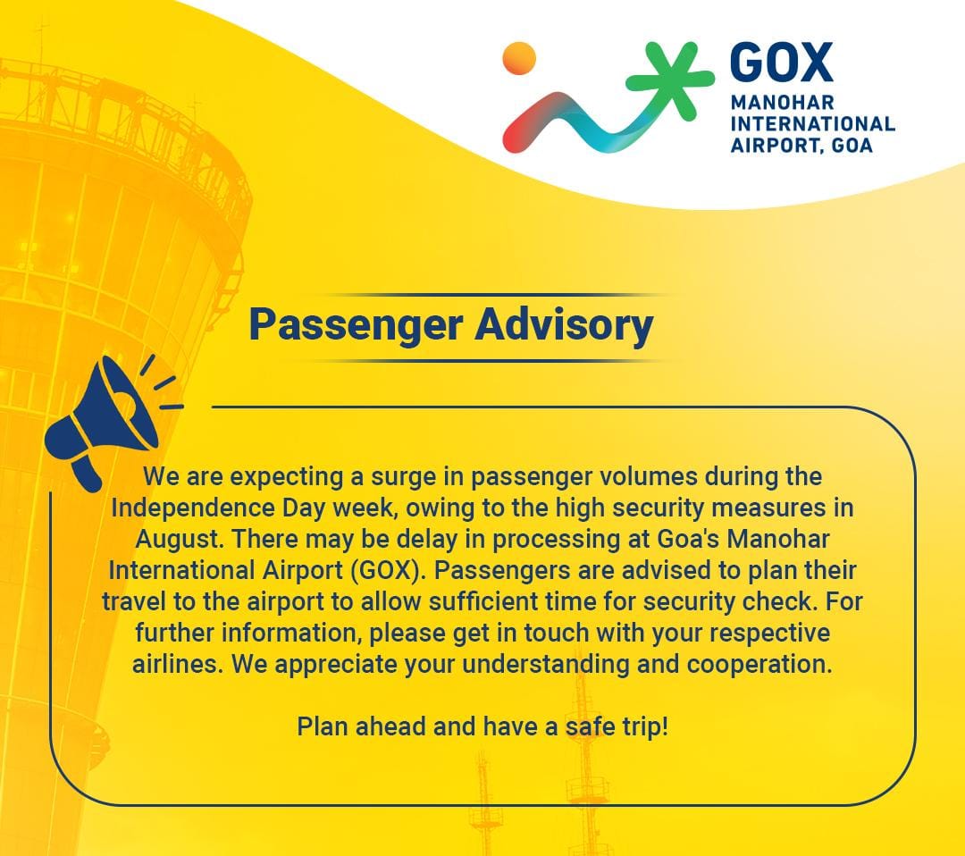 Mopa: Passengers flying through Goa’s Manohar International Airport (GOX) this week have been urged to arrive well in advance in view of enhanced security measures in place for Independence Day.