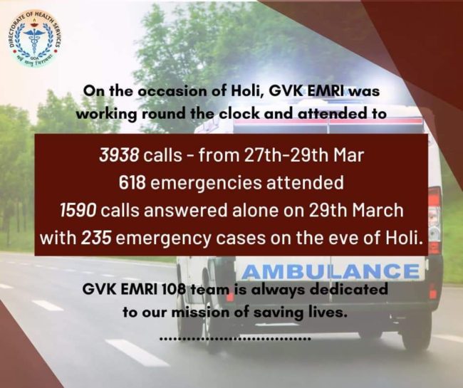 PANAJI: On the eve of the Holi weekend, followed by the Holi festival i.e. 27th, 28th & 29th March 2021, GVK EMRI run Emergency response centre & 108 ambulance fleet was kept on high alert to meet any eventuality during the festival of Holi.