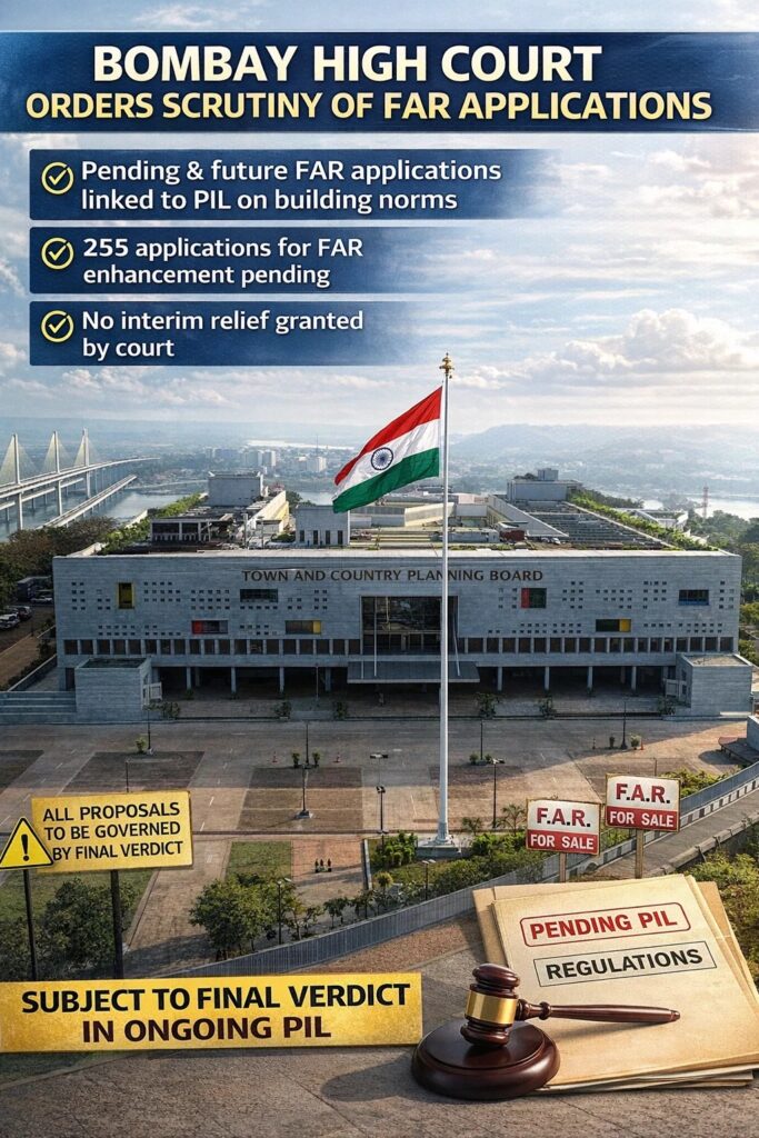 Panaji: The Bombay High Court has directed the Town and Country Planning Board to ensure that all pending and future applications seeking enhanced Floor Area Ratio (FAR) and height permissions are made subject to the outcome of an ongoing Public Interest Litigation (PIL) challenging recent amendments to building regulations.