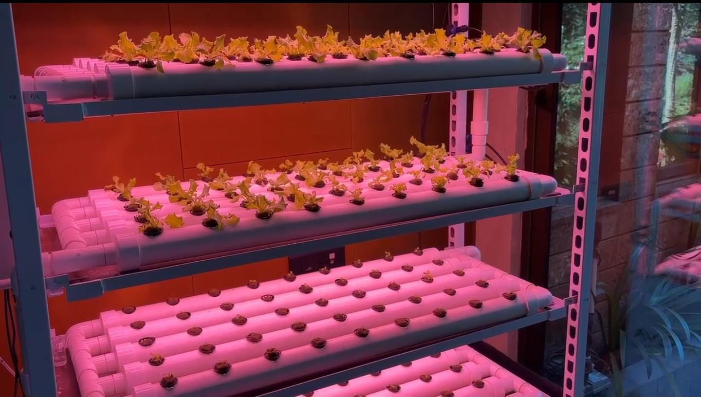The system uses patented spectrum grow lights with 14 hours of controlled lighting, enabling balanced nutrition, efficient growth, and predictable yields. This technology allows farmers to grow leafy greens such as lettuce, spinach, coriander, and mint, along with other climate-sensitive, high-value vegetables that are difficult to cultivate consistently through conventional farming methods in the region. Most crops under the system are ready for harvest within 45 days.