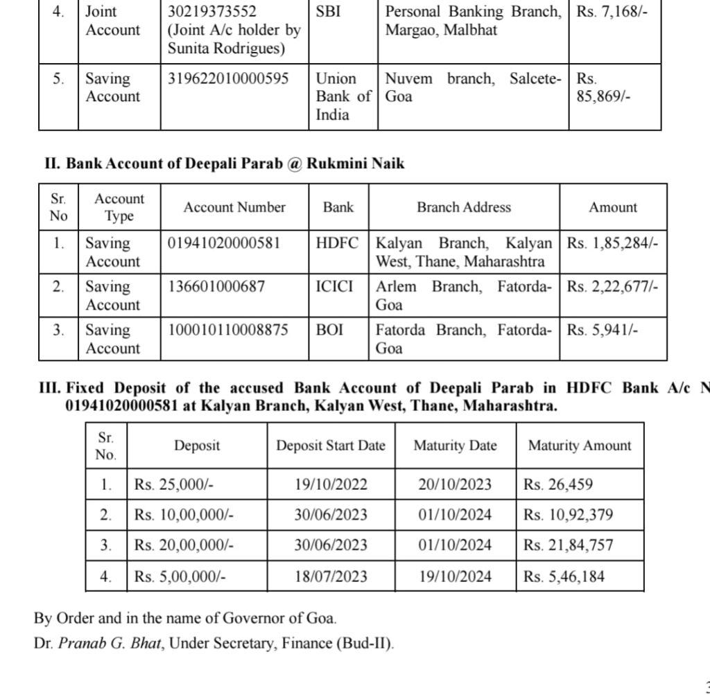 PANAJI: The Goa Government has issued an interim attachment order under the Goa Protection of Investors and Depositors Act, 2018, attaching 7 properties and multiple bank accounts belonging to Myron Rodrigues, his wife ex Sunita Rodrigues, and present wife Deepali Parab.