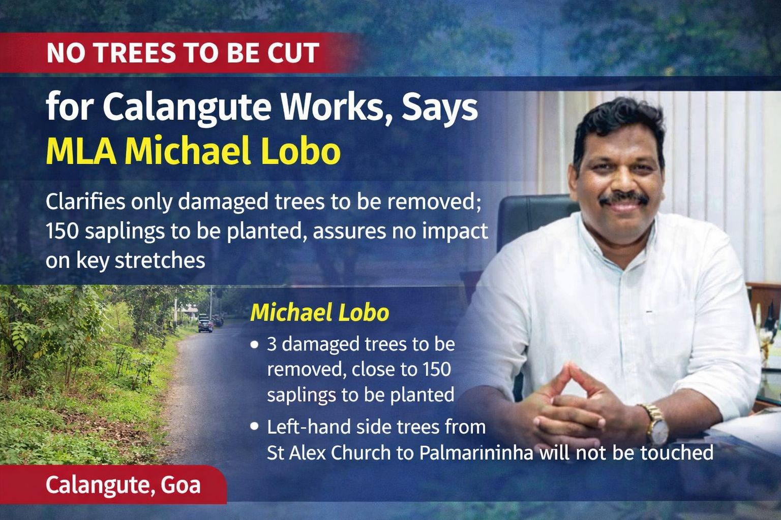 Calangute: Calangute MLA Michael Lobo has sought to allay public concerns over alleged large-scale tree cutting linked to ongoing development works in the area, terming such reports as misleading.