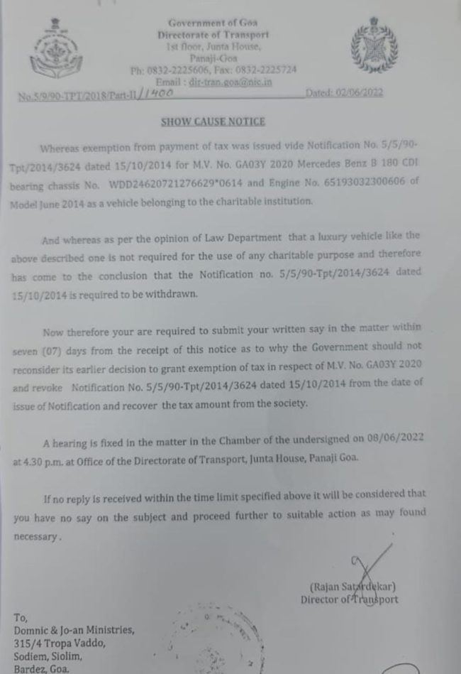PANAJI: The State government has tightened the noose around Dominic D’Souza, who was recently arrested in the religious conversion case, issuing him show cause over the road tax exemption given for the purchase of a Mercedes vehicle in 2014.