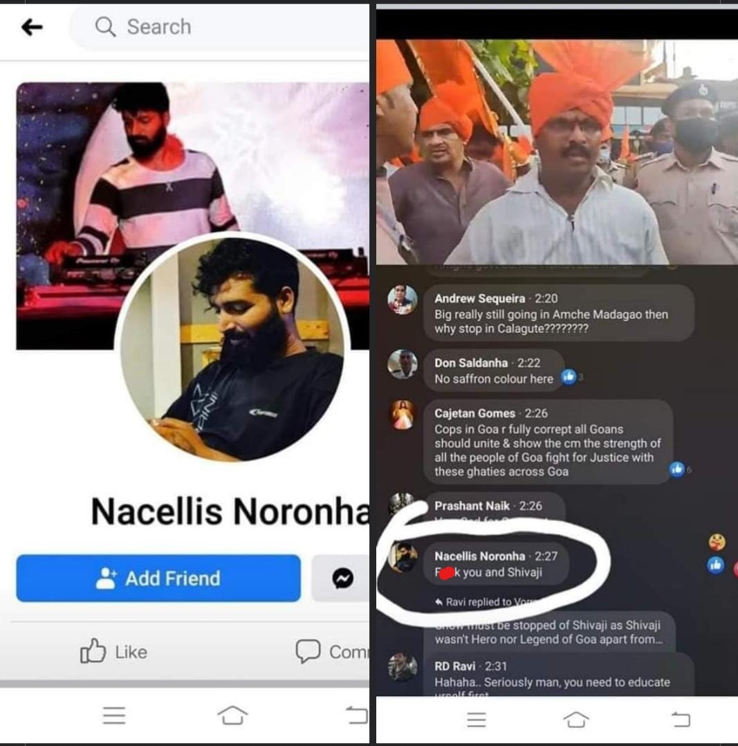 The press note by Anjuna police said that on 21.02.2021 Premanand Arol Sanghatana, Sioilm, Bardez Goa lodged complaint against Nacellis Noronha for posting vulgar comment against Chatrapati Shivaji Maharaj on the facebook thereby hurting the religious sentiments.