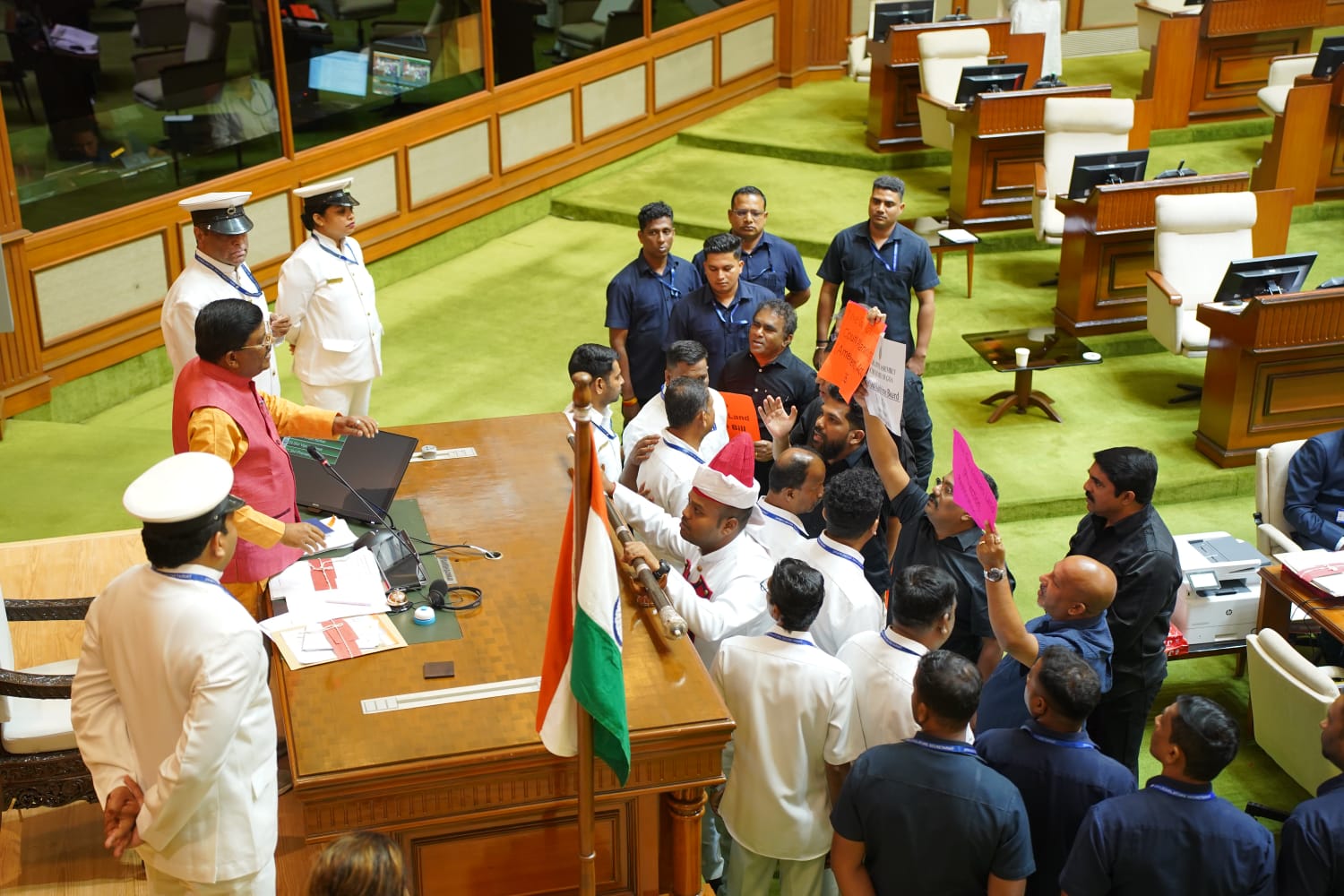 The protest intensified when the members questioned why their bills were not being permitted for introduction. Despite repeated appeals by the Speaker to allow the Chair to address the House, the Opposition continued raising slogans, leading to disruption of proceedings.