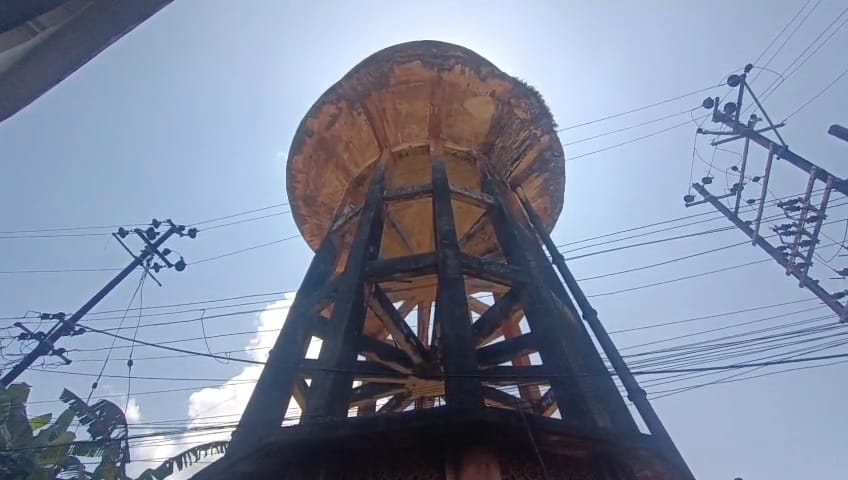 Residents reported that iron rods from the tank structure are now exposed, and the cement plaster is crumbling. “Just a few days ago, a heavy iron rod and chunks of cement fell on our houses. Some parts of the roof were damaged,” said a resident.