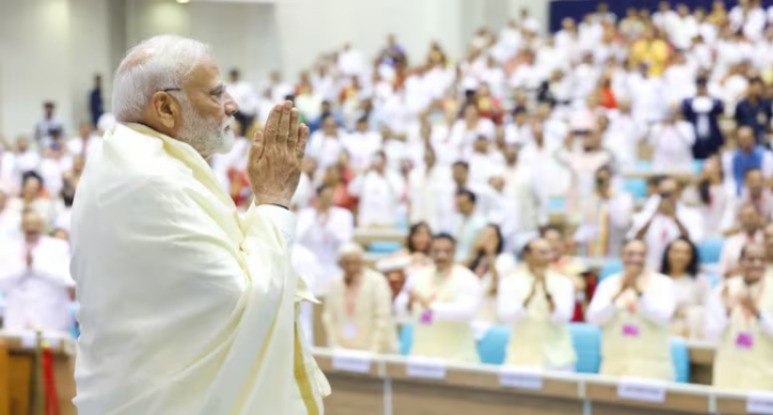 New Delhi: In a remarkable display of unity and spiritual harmony, Prime Minister Narendra Modi joined thousands in chanting the revered Navkar Mahamantra during the Vishwa Navkar Mahamantra Divas held at Vigyan Bhawan in Delhi. This global event aimed to foster peace, non-violence, and spiritual awakening worldwide. After the collective chanting, PM Modi emphasized the need for collective action by urging the nation to embrace nine resolutions for a better future.