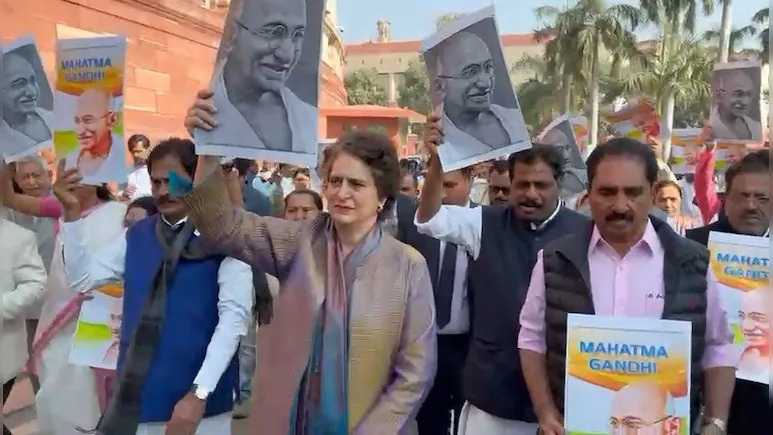 During a protest on Parliament premises, Congress lawmakers held up photographs of Mahatma Gandhi to signal their disapproval of removing his name from the rural employment scheme. Priyanka Gandhi called on the government not to pass laws based on “whim, ambition, or prejudice” and demanded that the Bill be withdrawn and reintroduced after proper discussion.