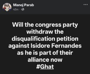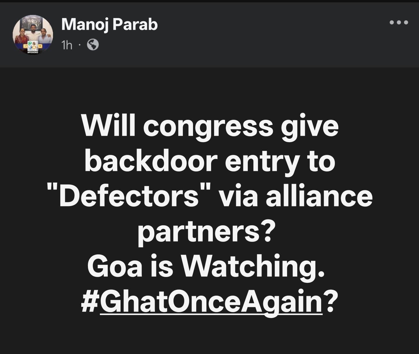 Parab, who took a swipe at the Congress on Facebook with the hashtag #GhatOnceAgain, said “Goa is watching” as he suggested that the party’s political manoeuvres resembled past episodes of defections and internal churn.