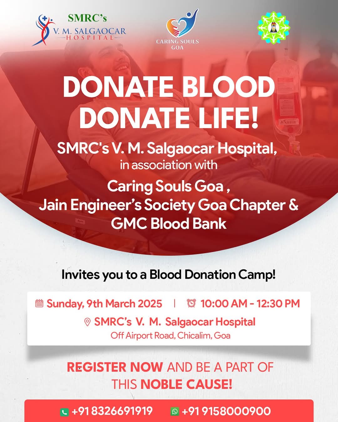 CHICALIM: In a noble initiative to support those in need, SMRC’s V. M. Salgaocar Hospital, in association with Caring Souls Goa, Jain Engineer’s Society Goa Chapter, and GMC Blood Bank, is set to host a Blood Donation Camp on Sunday, 9th March 2025. The event will take place at SMRC’s V. M. Salgaocar Hospital, Off Airport Road, Chicalim, Goa, from 10:00 AM to 01:00 PM.