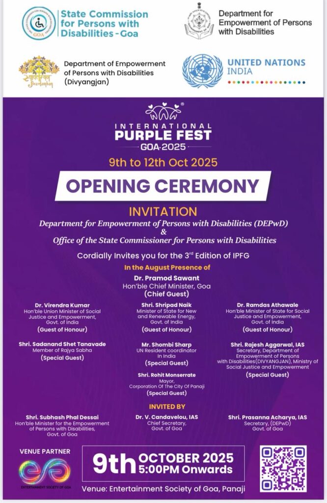 Day 1 will feature the International Convention of the Deaf, the All India State Commissioner Meet, Purple Think Tank sessions on technology, health, and political inclusion, and the Purple Experience Zone showcasing accessible innovations. With these initiatives, the festival continues to evolve as a landmark celebration of inclusion, empowerment, and creativity, establishing Goa as a global stage for transformative dialogue and expression.