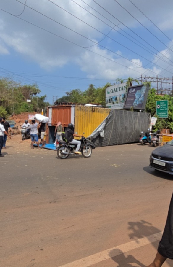 Sangolda: A container truck transporting raw materials overturned at a sharp bend in Sangolda on Tuesday morning, causing a brief disruption in traffic but resulting in no injuries.