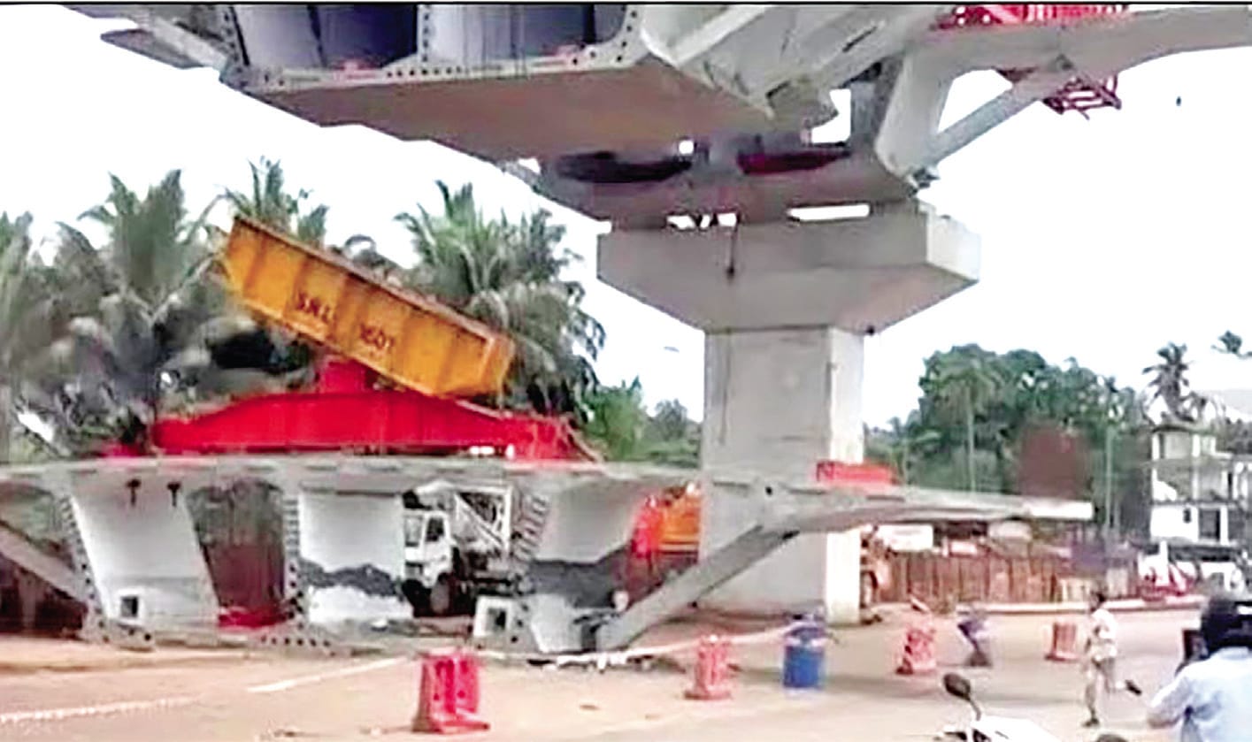 GUIRIM: A serious mishap was narrowly avoided on Sunday when a segment of the under-construction Porvorim elevated corridor collapsed near the Guirim junction, severely disrupting traffic along the busy Mapusa-Panaji route.