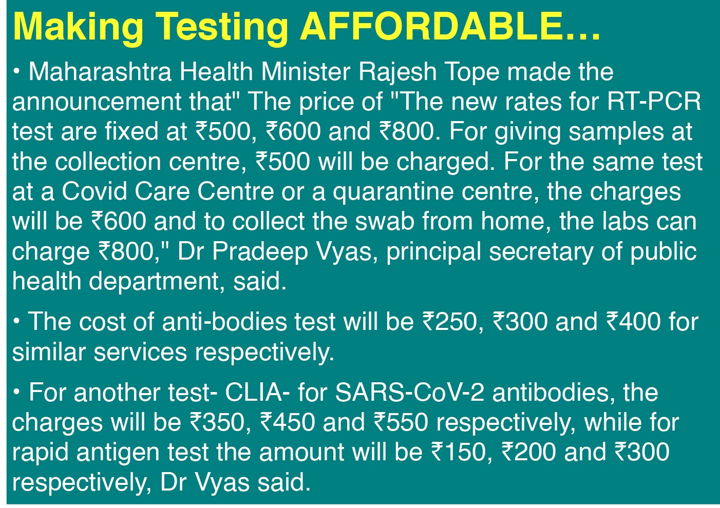 Maharashtra Health Minister Rajesh Tope made the announcement that” The price of “The new rates for RT-PCR test are fixed at ₹500, ₹600 and ₹800. For giving samples at the collection centre, ₹500 will be charged. For the same test at a Covid Care Centre or a quarantine centre, the charges will be ₹600 and to collect the swab from home, the labs can charge ₹800,” Dr Pradeep Vyas, principal secretary of public health department, said.