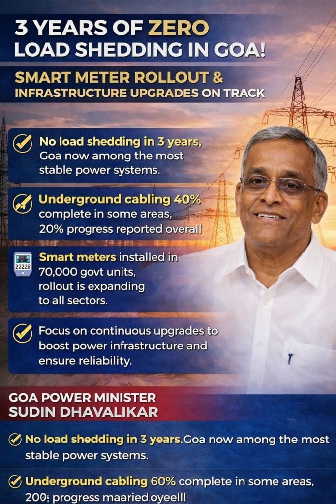 He said the power distribution network has seen significant improvement, resulting in better and more reliable service for consumers. However, the Minister noted that scheduled maintenance shutdowns remain necessary, particularly in parts of North Goa, and are planned and communicated in advance.